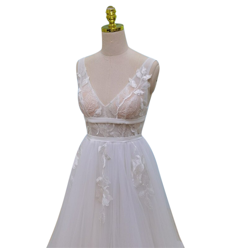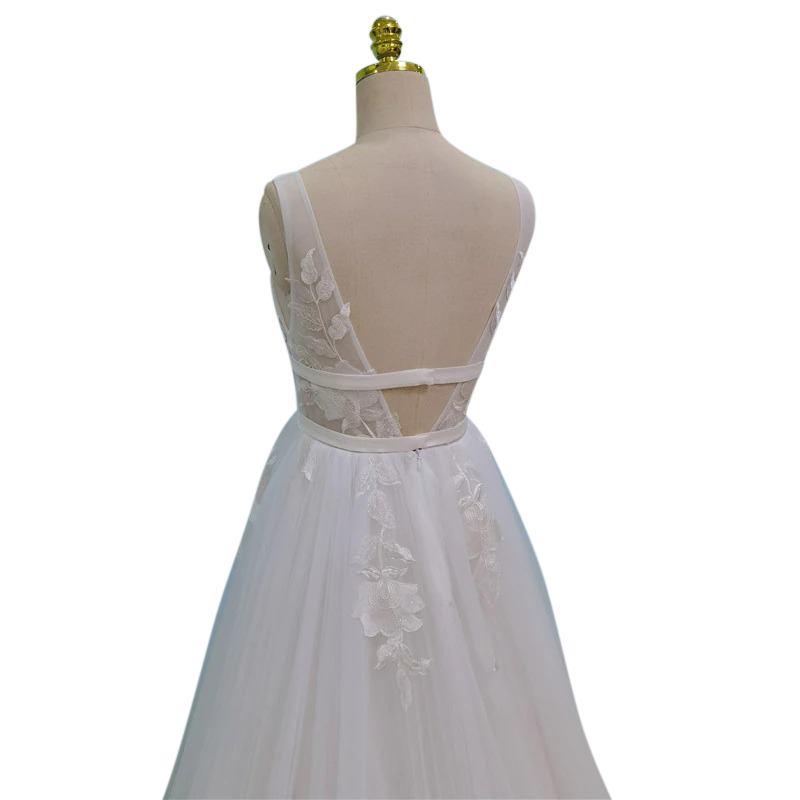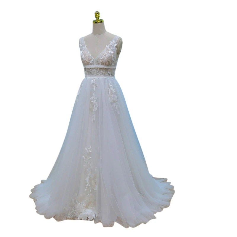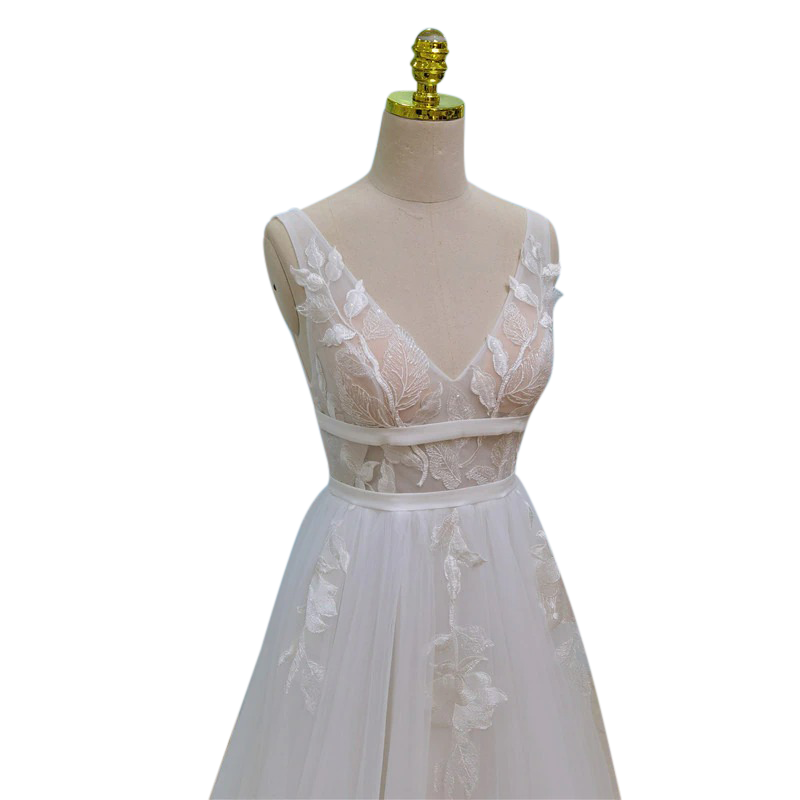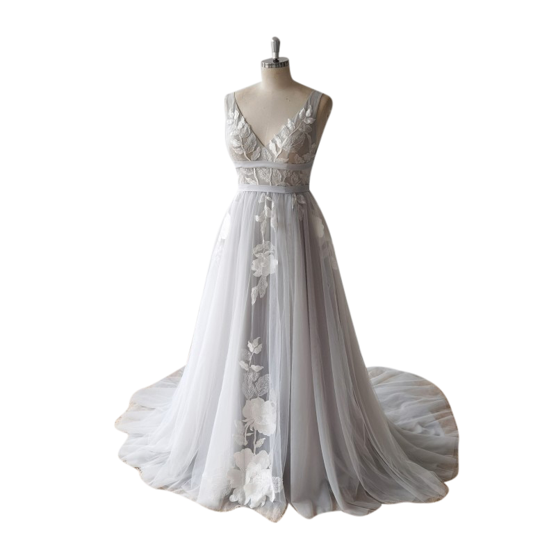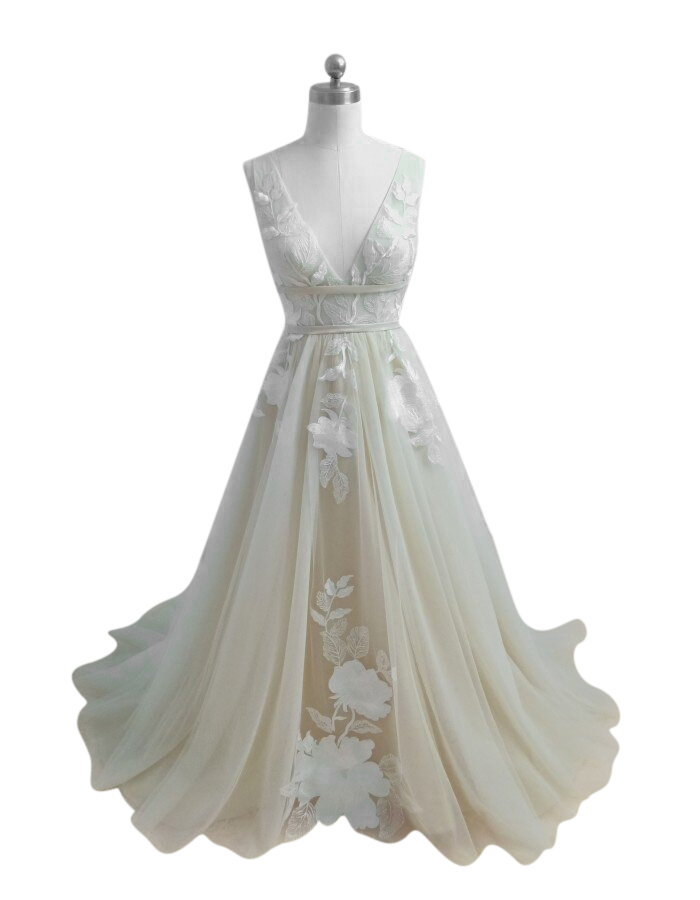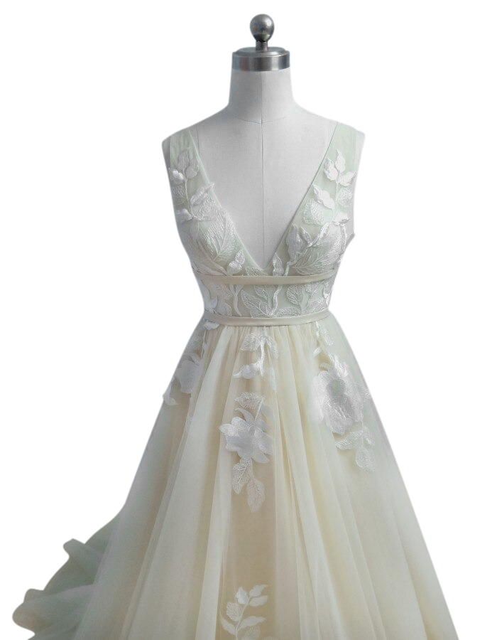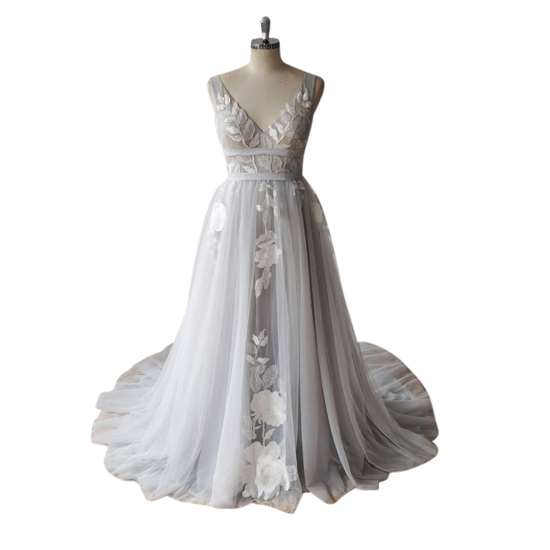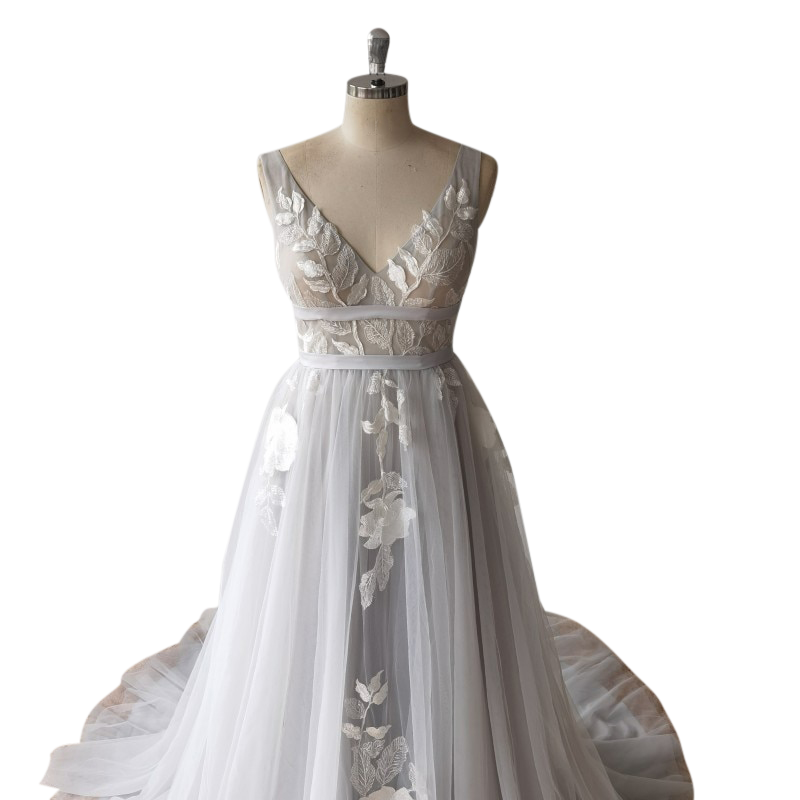 This dreamy A-line gown features a sheer illusion bodice with sculpted waist straps and a cascade of embroidered floral appliqués that tumble into the airy tulle skirt. Light, flowy, and feminine in all the right ways.