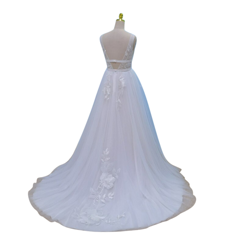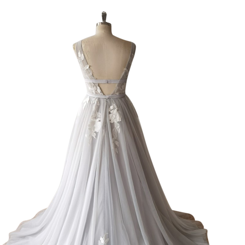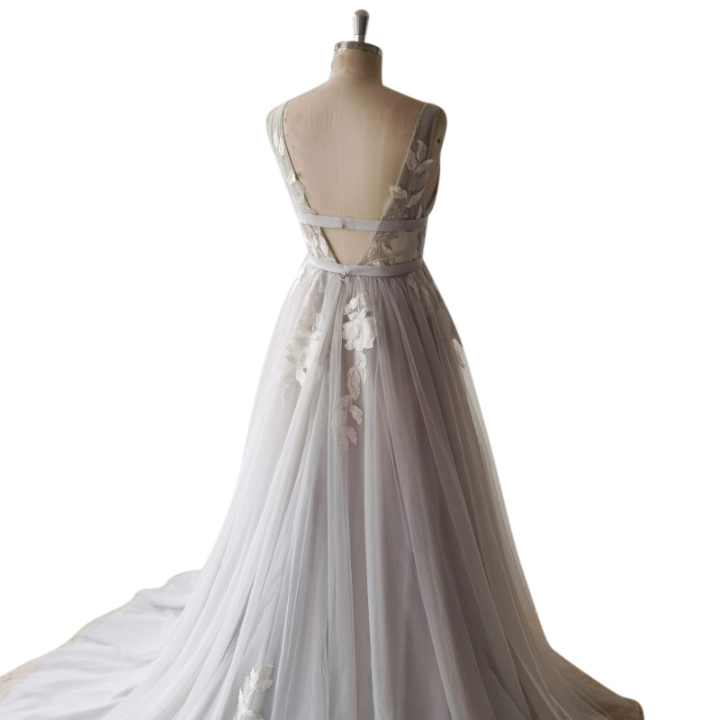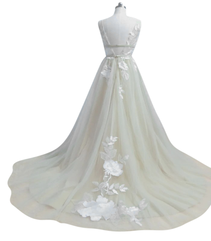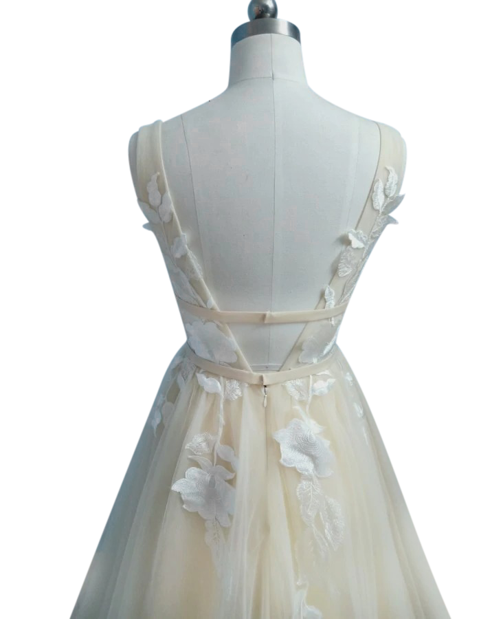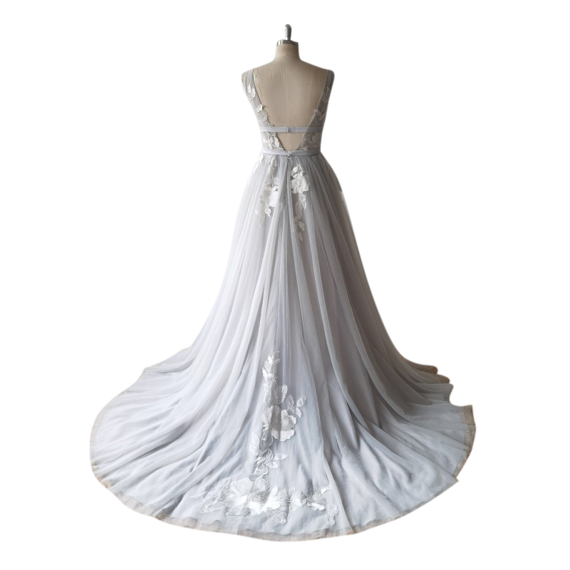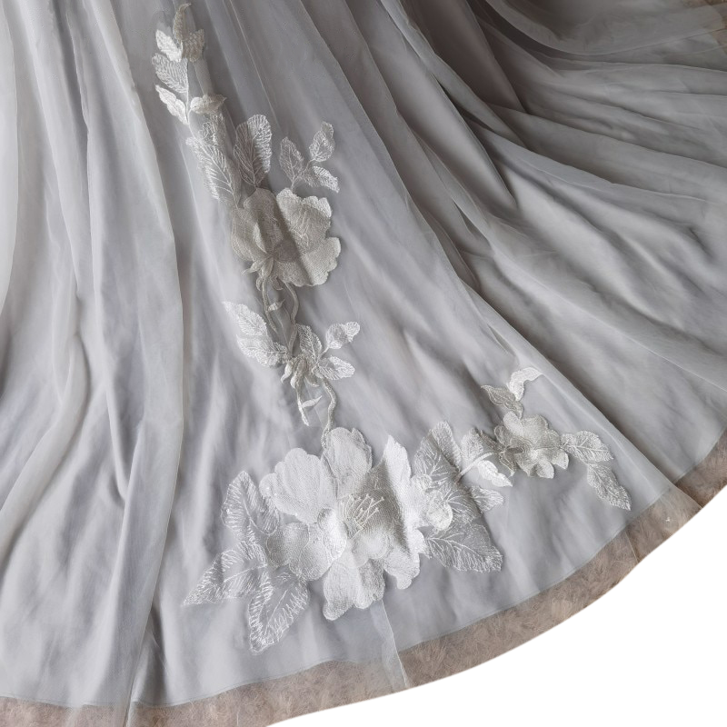 ✨ Flowy A-line tulle gown ✨ Bold floral appliqués throughout ✨ Open back with strap accents ✨ Zip closure for easy on & off ✨ Lined with our signature soft lining for breathable comfort and includes built in cups ✨ Court-length train that moves with ease